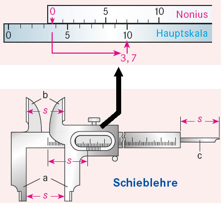 Ein Nonius (nach Pedro Nunes) ist eine Vorrichtung zum Ablesen von Zwischenwerten auf einer Skala, z. B. auf der Längenskala einer Schieblehre. Die Nonius-Skala hat meist zehn Teile, die zusammen so lang sind wie neun Teile auf der Hauptskala. Der Messwert, bestimmt durch den Nullpunkt des Nonius, wird dann auf eine Stelle nach dem Komma abgelesen, indem man denjenigen Strich auf dem Nonius sucht, der genau mit einem Strich auf der Hauptskala übereinstimmt (Abb.).
