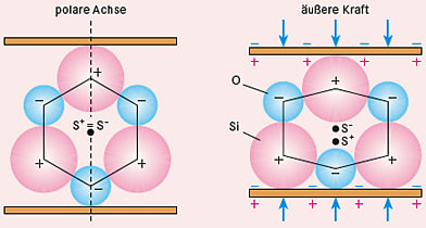 Wichtige piezoelektrische Kristalle sind Quarz, Turmalin, Seignettesalze und Zinkblende. Auf der Piezoelektrizität basieren verschiedene Drucksensoren.