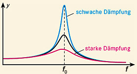 - Wenn schließlich die Erregerfrequenz mit der Eigenfrequenz des Federsystems übereinstimmt, erreicht die Amplitude einen Maximalwert (Resonanzfall). Je geringer die Dämpfung der Schwingung ist, desto größer ist dieser Maximalwert. Bei zu kleiner Dämpfung kann der Resonanzfall zur Zerstörung des schwingenden Systems führen.