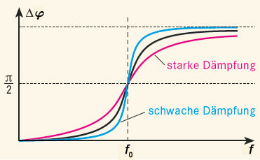 Mit der Änderung der Erregerfrequenz ändert sich auch die Phasenbeziehung zwischen der Erregerschwingung und der Schwingung des Körpers (Abb.). Während für kleine Frequenzen die Erreger- und Körperschwingungen in Phase ablaufen, verschieben sie sich mit zunehmender Frequenz um einen Winkel \(\Delta \varphi\) gegeneinander, bis im Resonanzfall die Erregerschwingung um 90° bzw. um \(\pi/2\) der erzwungenen Schwingung vorauseilt. Bei weiterer Vergrößerung nimmt die Phasendifferenz weiter zu und erreicht schließlich bei sehr hohen Frequenzen einen Wert von 180° bzw. \(\pi\), d. h., Erreger und und Schwinger bewegen sich gegenphasig. Die Phasenänderung erfolgt umso abrupter im Bereich des Resonanzfalls, je geringer die Dämpfung ist.