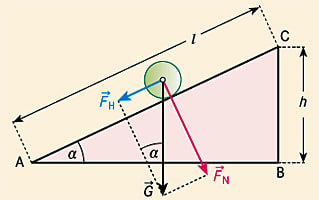In der Abb. ist die Strecke AC die Länge l und die Strecke BC als Höhe h der schiefen Ebene. h und l hängen über die Beziehung \(h/l = \sin \alpha\) zusammen.