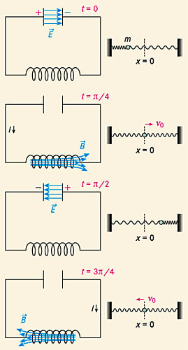 Übrigens: Wie in der Abb. angedeutet, sind die Vorgänge im Schwingkreis ganz analog zu einer mechanischen Schwingung, etwa eines Federpendels. Die elektrische Energie im Kondensator entspricht dabei der potenziellen Spannenergie der Feder.