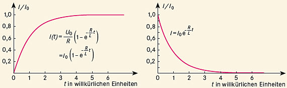 Lösungen dieser Differenzialgleichung sind in der Abbildung für den Einschalt- (links) und Ausschaltvorgang (rechts) skizziert. Man erkennt, dass sich die Endwerte \(I_0 = U_0/R\) bzw. 0 erst mit einer gewissen Verzögerung einstellen – auch im Gleichstromkreis fließt also nicht immer der gleiche Strom!