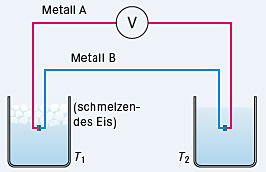 - Beim Seebeck-Effekt (nach Thomas J. Seebeck) wird Wärmenergie direkt in elektrische Energie umgewandelt wird. Er tritt auf, wenn in einem Leiterkreis aus zwei aneinander gelöteten Drähten aus unterschiedlichen Metallen (oder Halbleitern) die beiden Lötstellen auf unterschiedlichen Temperaturen T1 bzw. T2 gehalten werden (Abb.). In diesem Fall entsteht im Kreis eine elektrische Spannung, die Thermospannung oder Thermokraft U; durch den geschlossenen Stromkreis fließt ein Thermostrom.