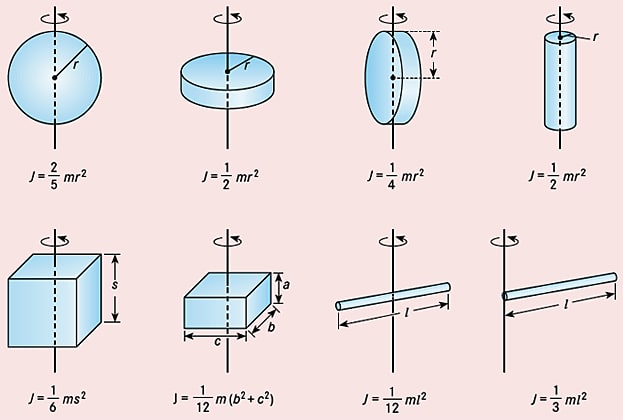 Die Größe in Klammern ist das Trägheitsmoment \(\displaystyle J = \sum_{i=1}^n m_ir_i^2 \).