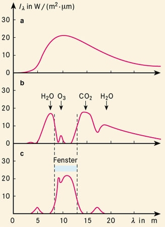 Die Stärke des natürlichen Treibhauseffekts hängt empfindlich von der Konzentration der Treibhausgase ab. Betrachtet man das Spektrum der von der Erde an den Weltraum abgegebenen Wärmestrahlung, erkennt man ein „Fenster“ mit nur geringer Absorption bei Wellenlängen um etwa 10 µm (Abb.). Da der Mensch seit Beginn der Industrialisierung die CO2-Konzentration in der Atmosphäre mehr als verdoppelt, nimmt die Absorption zu, das Fenster schließt sich und der Treibhauseffekt wird anthropogen (griech. „menschengemacht“) verstärkt. Dieser Effekt ist heute meistens gemeint, wenn über den Klimawandel oder die globale Erwärmung gesprochen wird.