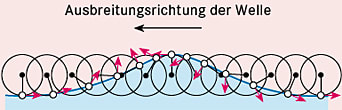 Bei Oberflächenwellen bewegen sich die Wassermoleküle auf kreisförmigen Bahnen, deren Durchmesser senkrecht auf der Wasseroberfläche stehen (Abb.).