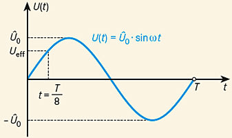 I(t) und U(t) sind die Momentanwerte von Wechselstrom bzw. Wechselspannung, \(\hat I\) und \(\hat U\) die Scheitelwerte oder Amplituden. Die Größe \(\omega = 2\pi f = 2\pi/T\) (f: Frequenz, T: Schwingungsdauer/Periode) ist die Kreisfrequenz des Wechselstroms und \(\varphi\) die Phasenverschiebung zwischen Strom und Spannung. Ueff (und entsprechend Ieff) sind die sog. Effektivwerte von Spannung und Strom. Eine Gleichspannung bzw. ein Gleichstrom mit diesen Werten würde dieselbe elektrische Leistung aufnehmen.